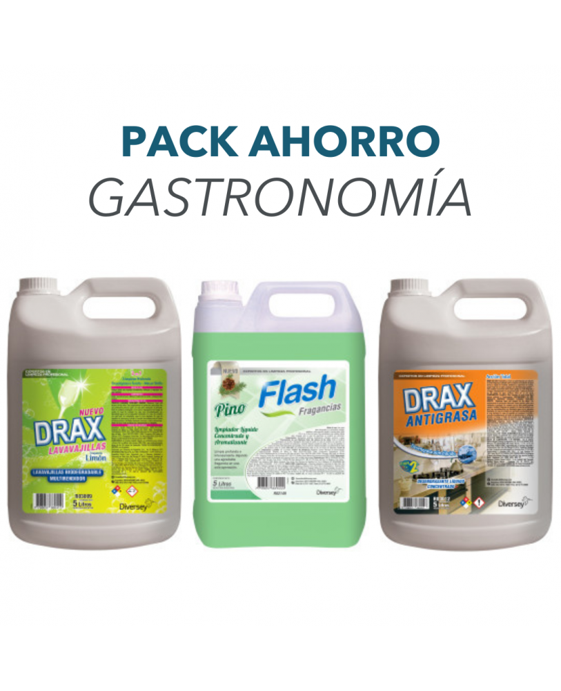 PACK AHORRO GASTRONOMÍA: 1 DRAX LAVAVAJILLAS + 1 FLASH FRAGANCIAS PINO + 1 DRAX ANTIGRASA